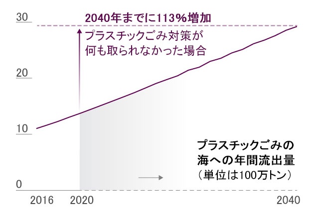 上の図のように、プラスチックゴミは対策をしない限り、増え続けていきます。