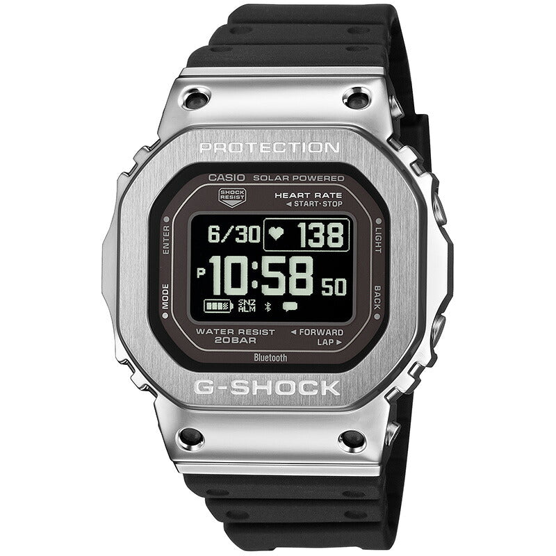 G-SHOCKのスポーツライン「G-SQUAD」から、日常生活で活躍するGM-H5600シリーズをご紹介します。DW-H5600の機能はそのままに、ベゼル部分にステンレススチールを採用し、より幅広いシーンで着用できる仕上がりとしました。さらに、ベゼルのディンプル部分に4カ所の切削穴を設けることで、ハイテクギア感とスポーティーな印象を高めています。また、裏蓋にはカーボンファイバー強化樹脂ケースを採用。ワークアウトに役立つ機能として、心拍計測が可能な光学式センサー、歩数計測が可能な加速度センサーを搭載。ランニング、ウォーキングやワークアウトに対応しています。また、ポラール社ライブラリによるトレーニング解析、睡眠による回復度の解析、呼吸エクササイズ等が可能で血中酸素レベル計測機能も搭載しております。視認性の高い高精細 MIP液晶を採用。USB充電とソーラー充電にも対応し、実用性も追求しました。