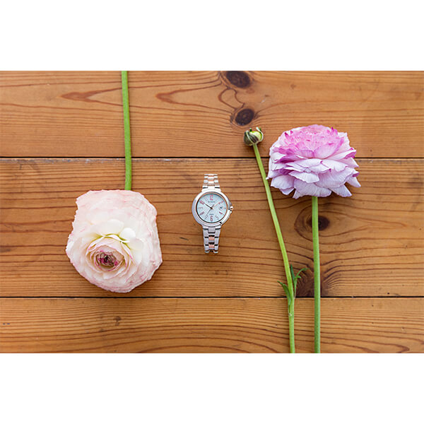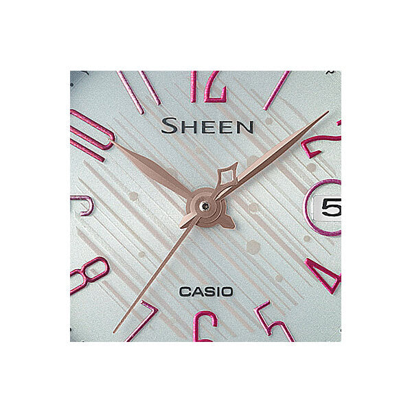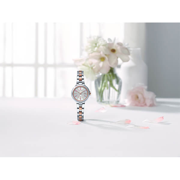 “輝き・煌き”を女性らしいデザインや機能で表現する 「SHEEN」の電波ソーラーから、木漏れ日をコンセプトにした5100シリーズにバイカラー仕様モデルが追加されます。フェイス中央に施した、光のデザインが木漏れ日の優しい陽の光を感じさせるモデルです。視認性の高いアラビック文字のインデックスには、明るめのピンクとベージュを使用し、光のゆらぎを表現。バンドにはシルバーとピンクゴールドのバイカラーを採用し、華やかな印象に仕上げました。