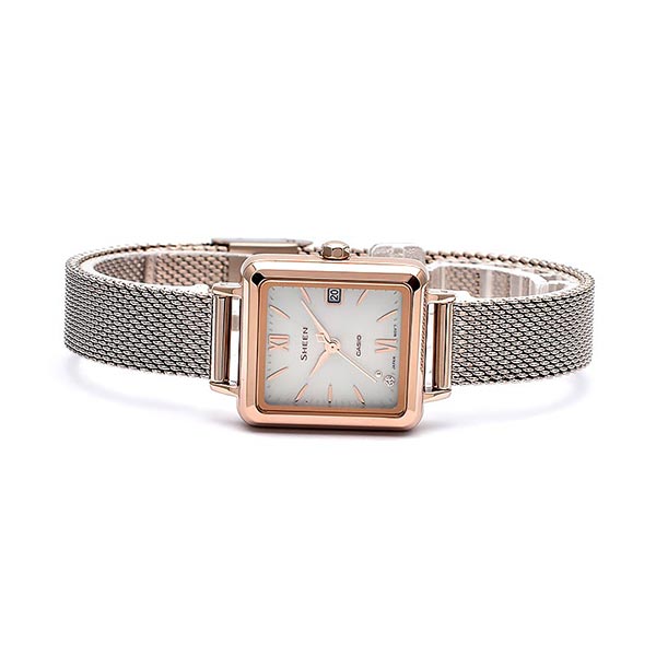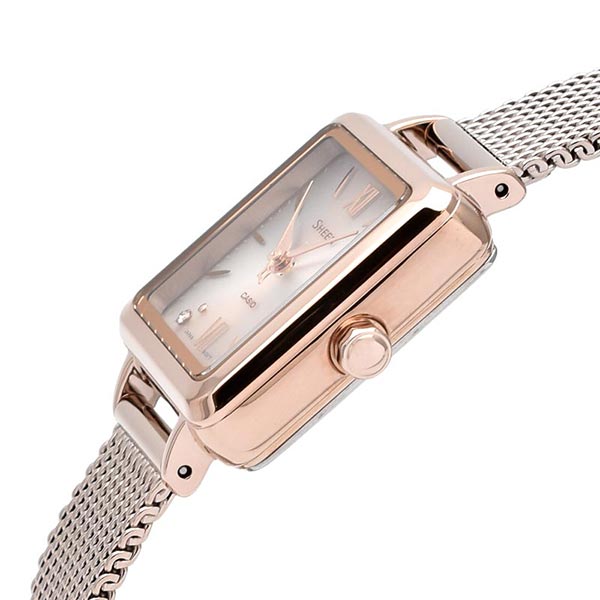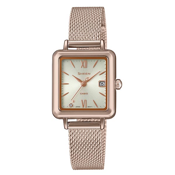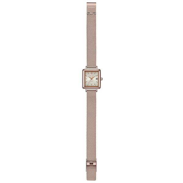 SHEENから、シンプルで着用しやすいNewモデルが登場します。視認性とデザイン性を兼ね備えたスクエアフェイスはデイリーユースに活躍します。文字板には幸運を意味する「7」時位置にクリスタルを施し、シンプルなフェイスに上品な煌めきを添えています。ソーラー充電システムや日付表示等の便利な機能を搭載しており、実用性も兼備。また、傷付きにくく、透明度の高い無反射コーティングサファイアガラスを採用しています。オン・オフ問わず様 々なシチュエーションで着用できるモデルです。