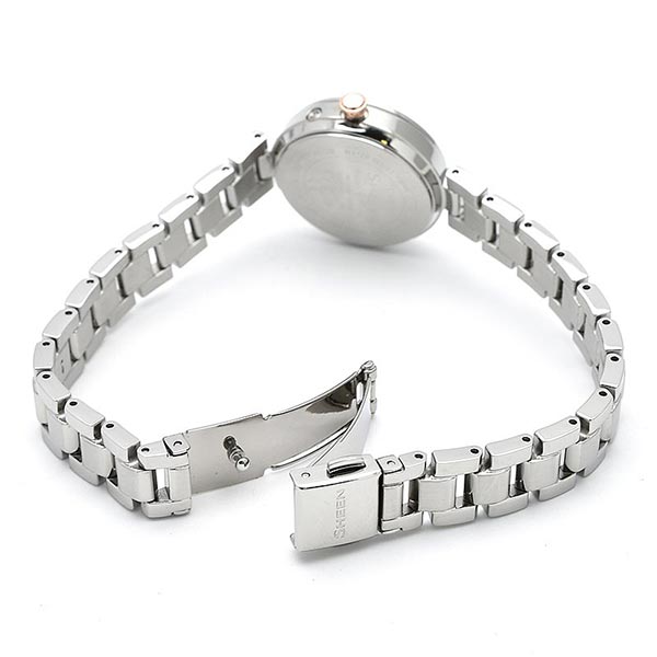 丸みのあるベゼルと、一本足形状のメタルバンド採用により、上品でフェミニンな印象に仕上げた小型サイズのチタンモデルです。文字板にはアラビックインデックスと柔らかなフォルムのリーフ型インデックスを採用し、視認性にもこだわりました。また、9時側のクリスタルの輝きが、ワンポイントアクセントになっています。