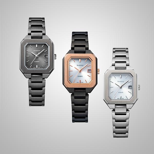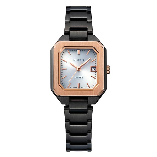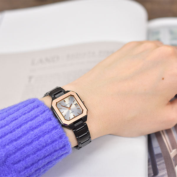 エレガントとクールが融合した新型モデルです。ブラック×ピンクゴールド、ダークグレー、シルバーの3タイプをご用意。ベゼルはヘアライン仕上げ、ケース側面はミラーで仕上げることでマニッシュな印象に。電池交換の手間が軽減するソーラー充電システムや日付表示機能を搭載。また、傷付きにくい高硬度の反射防止コーティングサファイアガラス、5気圧防水機能も採用しています。