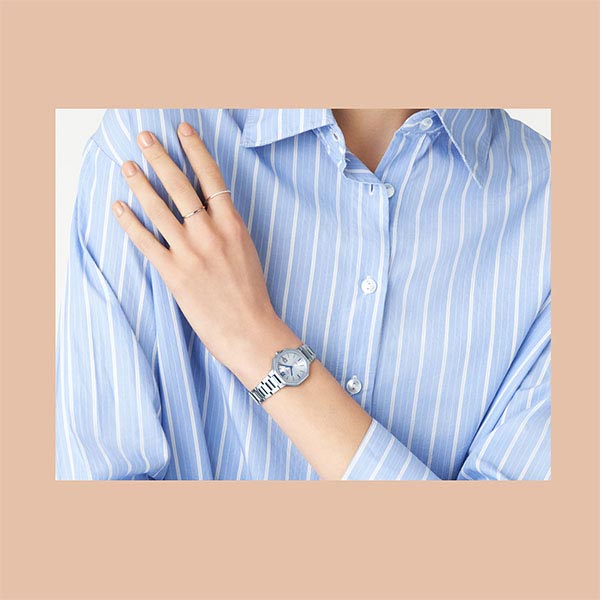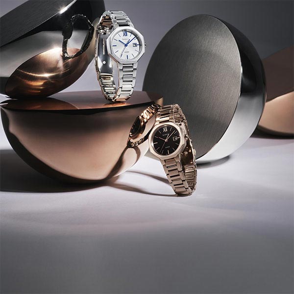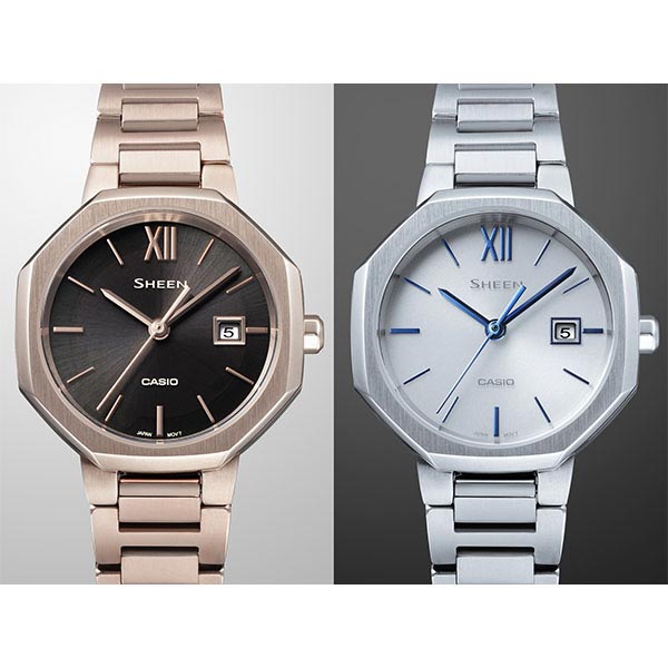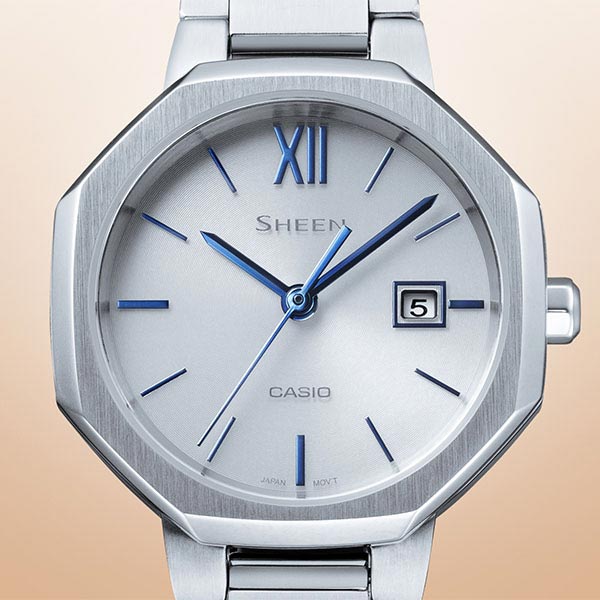 クールとエレガントが融合した SHEEN の新型モデルです。マニッシュな服装に合わせやすい、シルバーとピーチゴールド×ブラックの2色をご用意。フェイスはシンプルな丸ダイアルに八角形のケースを合わせることで、シャープでエレガントな印象に仕上げました。ベゼル・バンドの天面はヘアラインで仕上げ、ベゼルケース側面はミラー仕上げにすることで質感を高めています。機能面では定期的な電池交換の手間が軽減するソーラー充電システムや日付表示を搭載。また、傷付きにくい高硬度の反射防止コーティングサファイアガラス、5気圧防水機能も採用しています。 SHS4529D7AJF