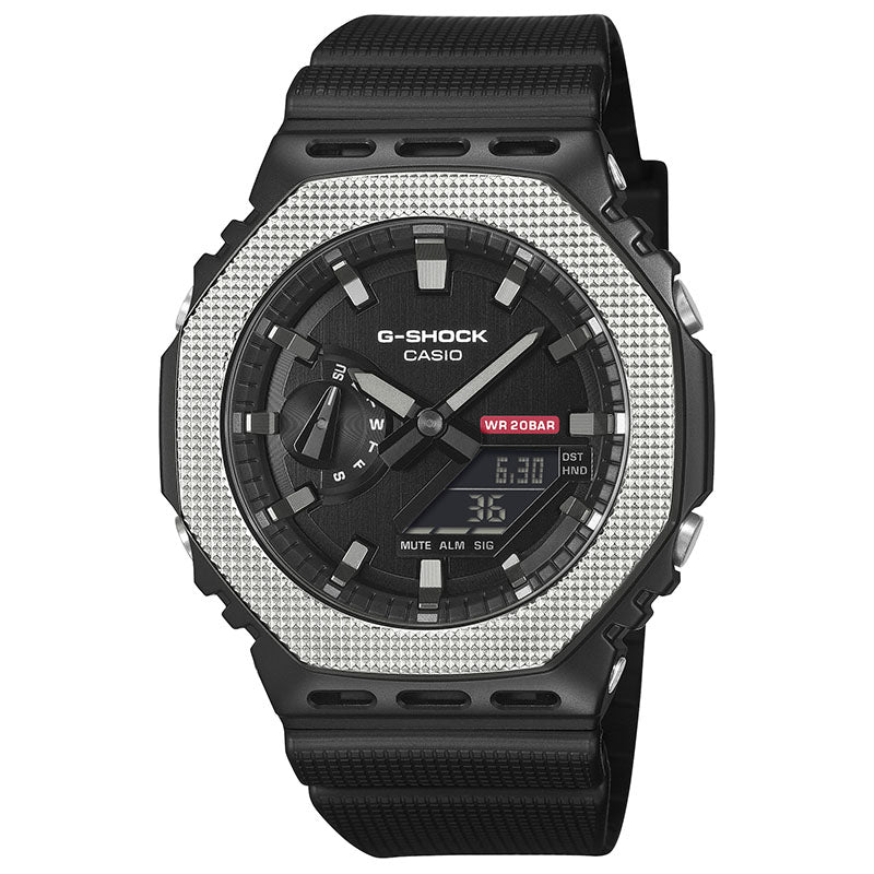タフネスを追求し進化を続けるG-SHOCKから、モダンなインダストリアルデザインをテーマに機能美を追求し、G-SHOCKの耐衝撃性の要素をシンプルにデザインに落とし込んだモデルです。ベースモデルには、メタルベゼルを採用したアイコニックスタイルのデジタルモデルGM-5600と、アナログ・デジタルコンビネーションモデルGM-2100を使用しています。シンプルさと機能美の共存を目指し、無彩色のカラースキームを採用。G-SHOCKの耐衝撃性を象徴するメタルの八角形ベゼルには、モダンインダストリアルデザインでも多く見られるチェッカリングパターンを施し、メタルベゼルや、機能表示をマーキングした赤いアクセントカラーが、機能性を豊かに表現しています。ベゼルの切削穴からは、耐衝撃構造を実現するためにモジュールを保護しているガラスファイバー強化樹脂製のセンターケースが見え、耐衝撃構造を視覚的に表現しています。GM-5600BMおよびGM-2100BMでは、ベゼルの天面以外のパーツにブラックIPを施すことで、ベゼルのフォルムに奥行きと引き締まった印象を与え、シックな佇まいに仕上げています。シンプルで普遍的なデザインと実用的な機能を併せ持ち、長く愛用できるアイテムです。