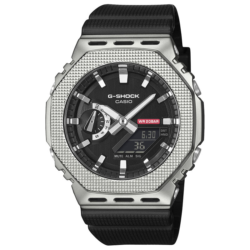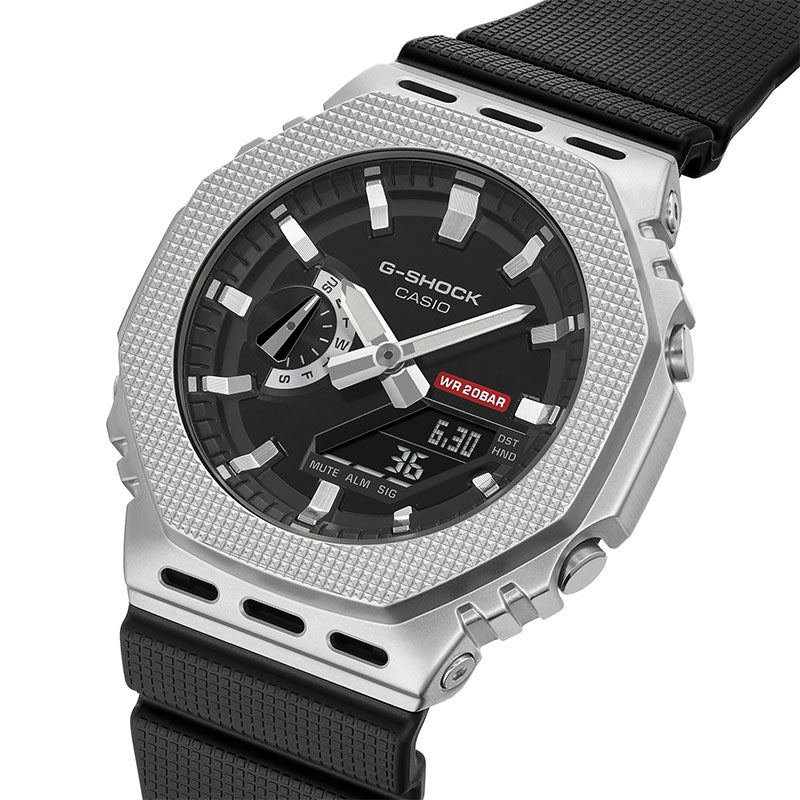 タフネスを追求し進化を続けるG-SHOCKから、モダンなインダストリアルデザインをテーマに機能美を追求し、G-SHOCKの耐衝撃性の要素をシンプルにデザインに落とし込んだモデルです。ベースモデルには、メタルベゼルを採用したアイコニックスタイルのデジタルモデルGM-5600と、アナログ・デジタルコンビネーションモデルGM-2100を使用しています。シンプルさと機能美の共存を目指し、無彩色のカラースキームを採用。G-SHOCKの耐衝撃性を象徴するメタルの八角形ベゼルには、モダンインダストリアルデザインでも多く見られるチェッカリングパターンを施し、メタルベゼルや、機能表示をマーキングした赤いアクセントカラーが、機能性を豊かに表現しています。ベゼルの切削穴からは、耐衝撃構造を実現するためにモジュールを保護しているガラスファイバー強化樹脂製のセンターケースが見え、耐衝撃構造を視覚的に表現しています。GM-5600BMおよびGM-2100BMでは、ベゼルの天面以外のパーツにブラックIPを施すことで、ベゼルのフォルムに奥行きと引き締まった印象を与え、シックな佇まいに仕上げています。シンプルで普遍的なデザインと実用的な機能を併せ持ち、長く愛用できるアイテムです。