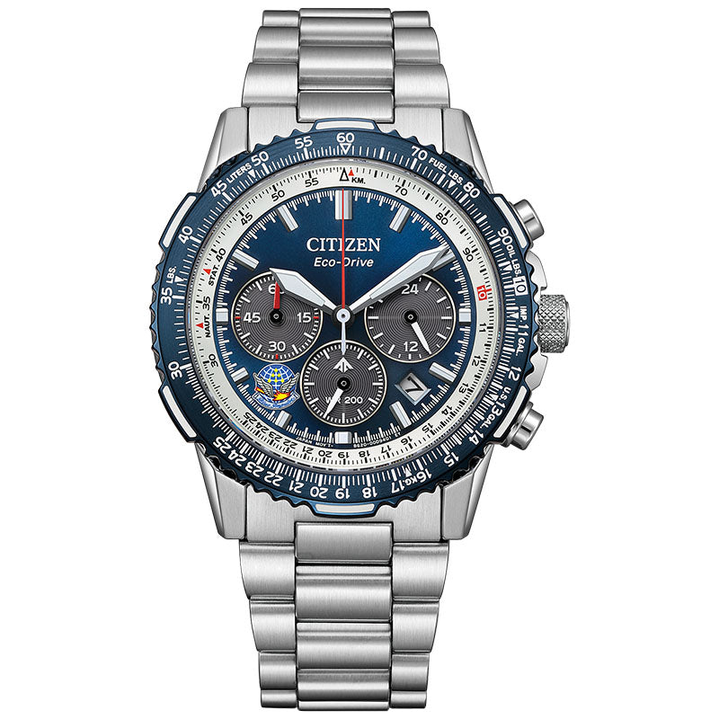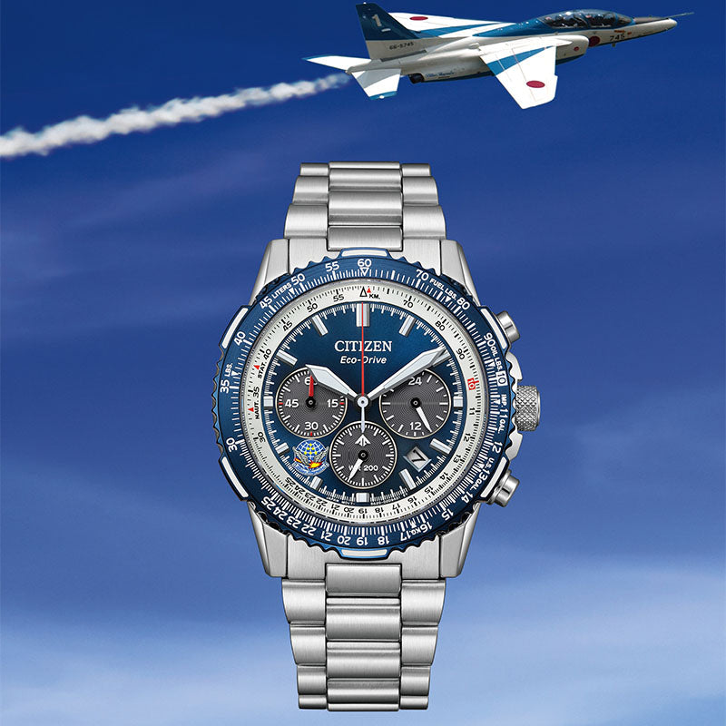 機能性、耐久性、安全性を兼ね備えた本格スポーツウオッチ、シチズン PROMASTER(プロマスター)。ケース径40mmのサイズ感を生かした、力強く爽やかなデザイン。航空自衛隊「ブルーインパルス」をイメージした限定モデル第6弾。・2025年に創設65周年を迎える航空自衛隊アクロバット飛行チーム「ブルーインパルス」から着想を得た限定モデルです。・ケース径40mmのコンパクトなサイズで、腕が細い方にも違和感なくフィット。より多くのブルーインパルスファンの心をとらえる、使いやすい1本です。・ブルー文字板×メタルバンド、シルバー文字板×革バンドの2モデル。ブルーインパルスのチームカラーを想起させるブルーとシルバーの配色が、力強さと爽やかさを感じさせます。・文字板と裏ぶたに、ブルーインパルスのエンブレムをレイアウト。専用ボックスの中には、ブルーインパルスの現行機種T-4の飛行シーンを印刷したカードが入っています。