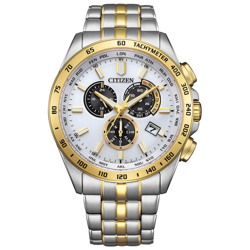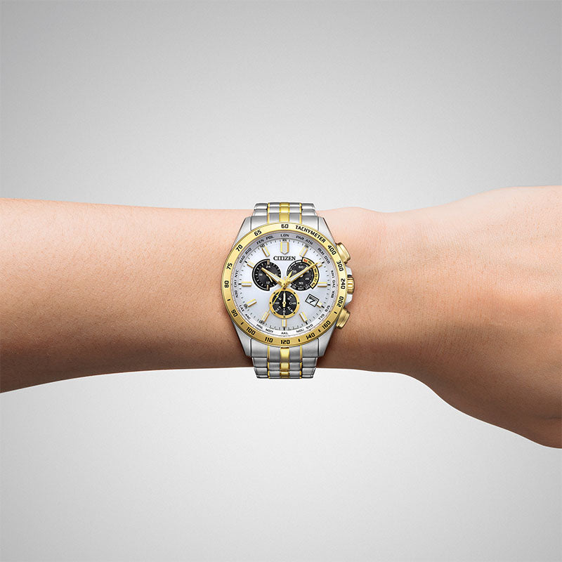 ・シチズンコレクションのロングセラー、グローバル電波時計モデルに新色が仲間入り。ゴールド×シルバーの存在感あるデザインが、大人の腕元に華やかさを添えます。・やや大きめの43mmケースを採用したエコ・ドライブ電波時計。定期的な電池交換や時刻合わせ不要の手軽さ、夜光付きの太い針とインデックスによる視認性の良さが魅力です。・バンドの中ゴマには、ミラー仕上げのゴールドラインをアクセントとしてプラス。文字板、針、りゅうずにもゴールドのパーツを使い、華やかな印象を演出しています。