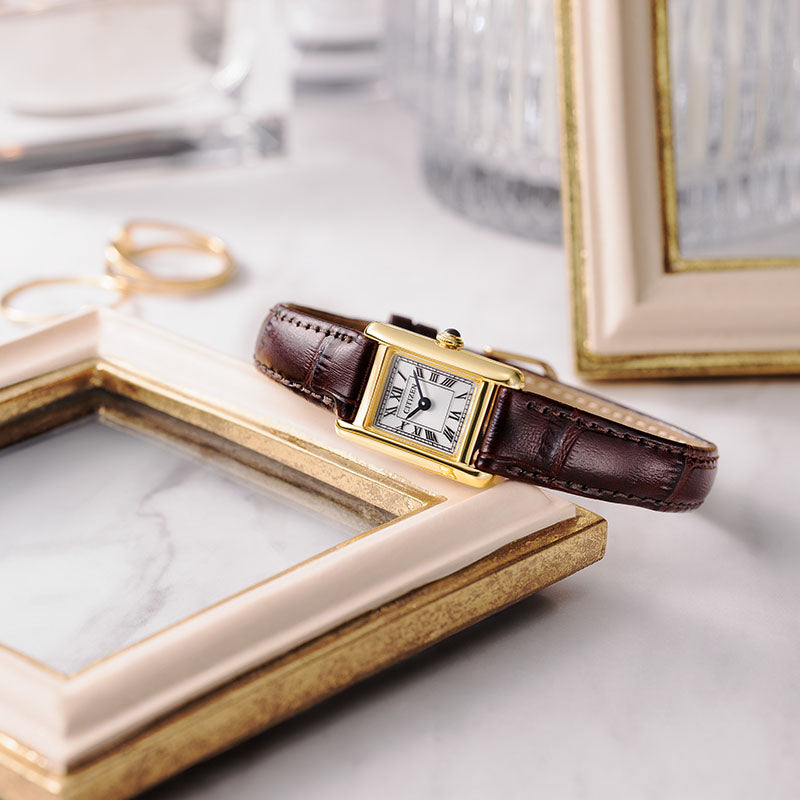 アンティークデザインのエコ・ドライブアクセサリーウオッチシチズン Kii: (キー)。時代を超えて愛される、クラシカルな表情のスクエアケースモデルが復活。ヴィンテージ調の雰囲気を漂わせながらも、
