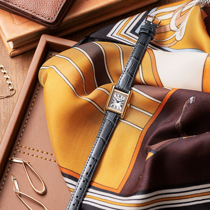 ・ローマ数字で統一したインデックスと型押しを施した牛革バンドが、落ち着きのあるクラシカルな表情を際立たせています。