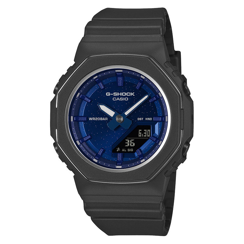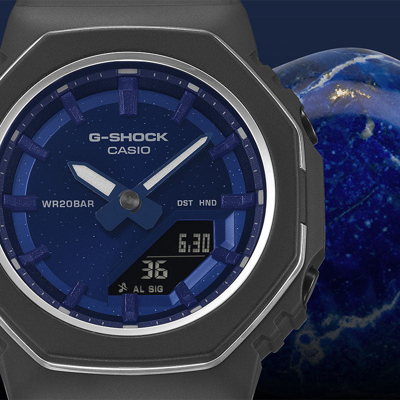 GMA-P2110シリーズに天然石からインスパイアを受けたカラーダイアルのシリーズが仲間入り。「ネイビー」「ライトピンク 」の2色で展開する本シリーズは、それぞれ「ラピスラズリ」「ローズクォーツ」をイメージしています。GMA-P2110SC-2AJFはラピスラズリの美しい斑点をパールプリントでさりげなく表現。GMA-P2110SC-4AJFはローズクォーツの柔らかい印象をグラデーションで表しました。文字板にはメタル素材を採用し質感をアップ。天然色のような美しい発色を実現しています。またそれぞれ、ラピスラズリは「幸運」、ローズクォーツは「美と健康」という石言葉を持ち、ギフトに添えられるようなメッセージも込めました。ホリデーシーズンにもピッタリなモデルです。