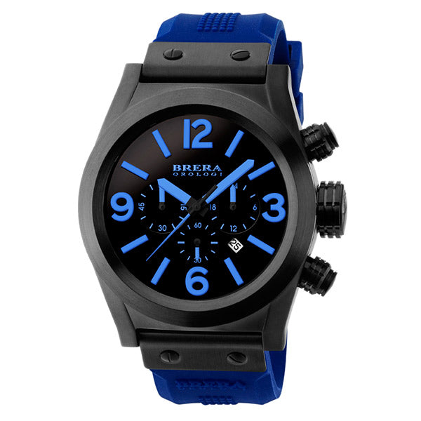 ブレラオロロージの「BRETC4565」 ステンレス素材の樽型ケースとラバー素材のベルト。文字盤の12時位置にはブランドロゴを配置しています。機能としてクロノグラフ、スモールセコンド、60分計等を搭載。また、中留め構造は穴留め式です。