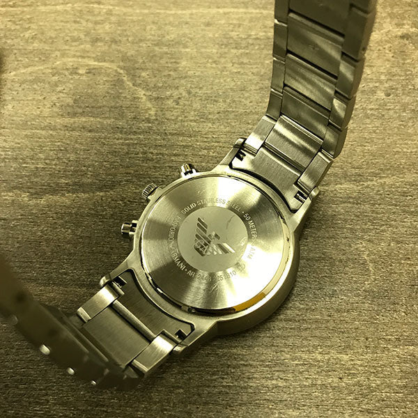 エンポリオ・アルマーニの「AR2448」 ステンレス素材で統一された丸型ケースとベルト。文字盤の12時位置にブランドロゴを配置しています。機能として、クロノグラフ、24時間表示等を搭載。また、中留め構造は両開きプッシュ式です。