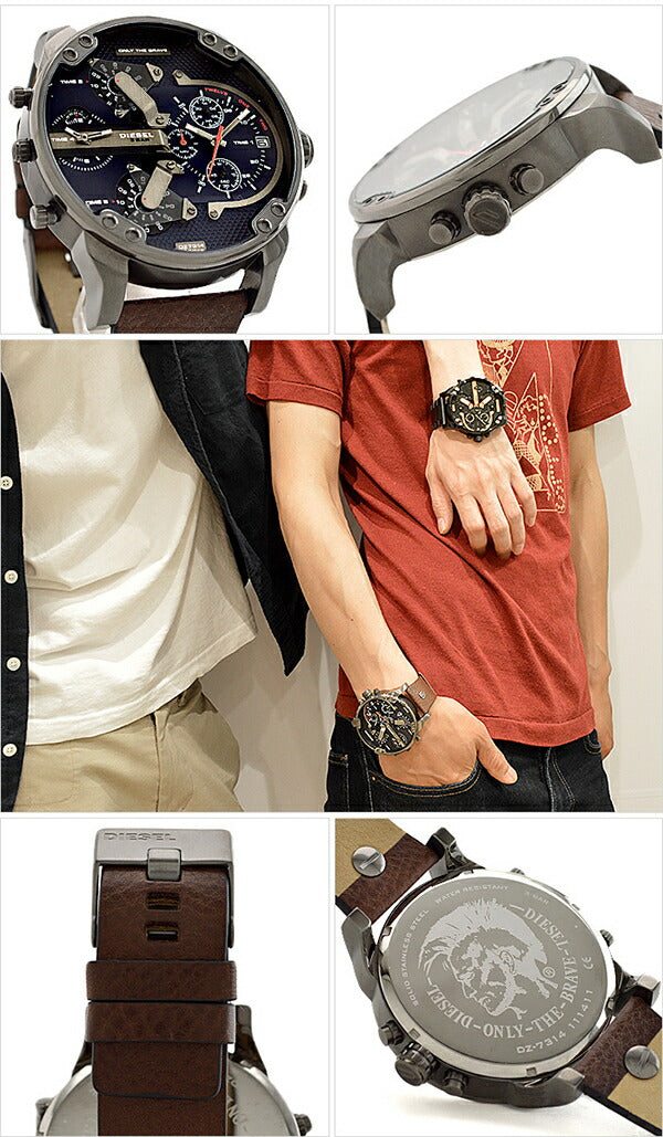 ディーゼルの「DZ7314」 ステンレス素材の丸型ケースと、レザー素材のベルト。ネイビーの文字盤には、日付表示機能、クロノグラフ、他に機能として、クアトロタイム(4地域時刻表示)、スクリューバック等を搭載。また、中留め構造は穴留め式を採用しています。