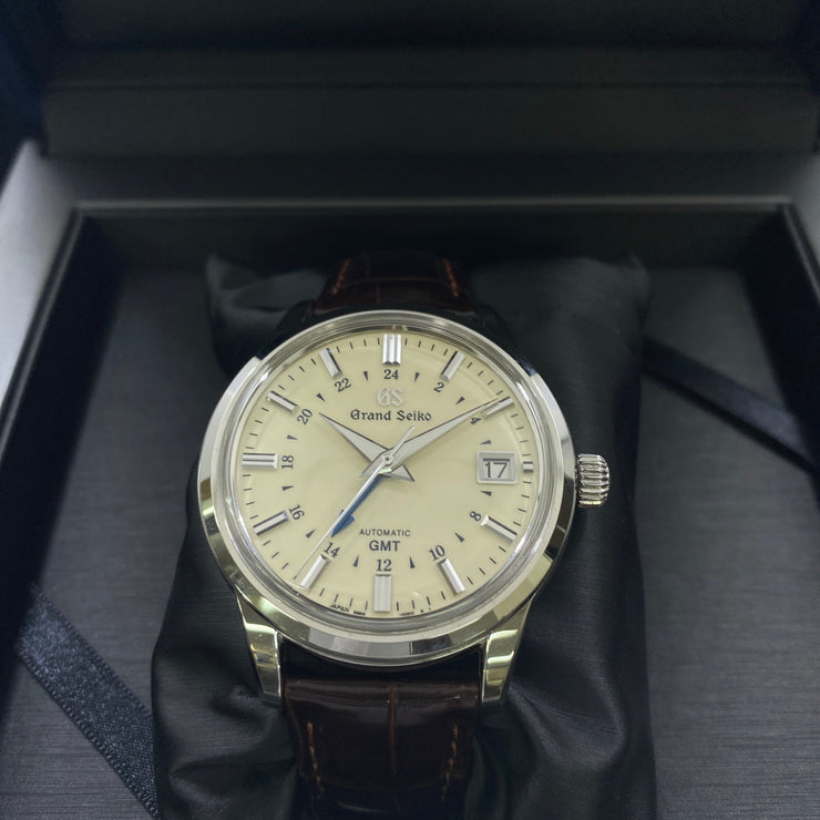 セイコー グランドセイコー メカニカルGMT 「SBGM021」。最大巻上時約72時間(約3日間)の持続時間、耐衝撃性、耐磁性に優れるSPRON610製ひげぜんまいなど、基本性能を高めた9S66キャリバーを搭載。24時間針、デュアルタイム機能、カレンダー連動時差修正機能がついた、緻密で精悍な表情のメカニカルウオッチです。