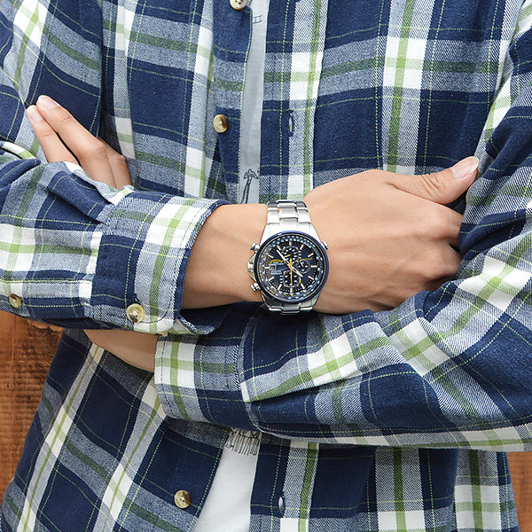 2008年8月に発売したブルーエンジェルスモデルが新たな装いで登場。スポーティかつ視認性のある文字板、操作性に優れたムーブメントH800を搭載したウオッチ。文字板、ベゼル、革バンド(AT8020-03L)は「ブルーエンジェルス」カラーを採用。裏ぶたには「ブルーエンジェルス」のエンブレムが入っています。世界43都市のワールドタイム・UTC(協定世界時)に加え、ユーザー任意でホーム都市の時差を設定可能。本格的な航空時計の証ともいえる航空計算尺を搭載。世界4エリア(日本、中国、ヨーロッパ、北米)で電波を受信します。
