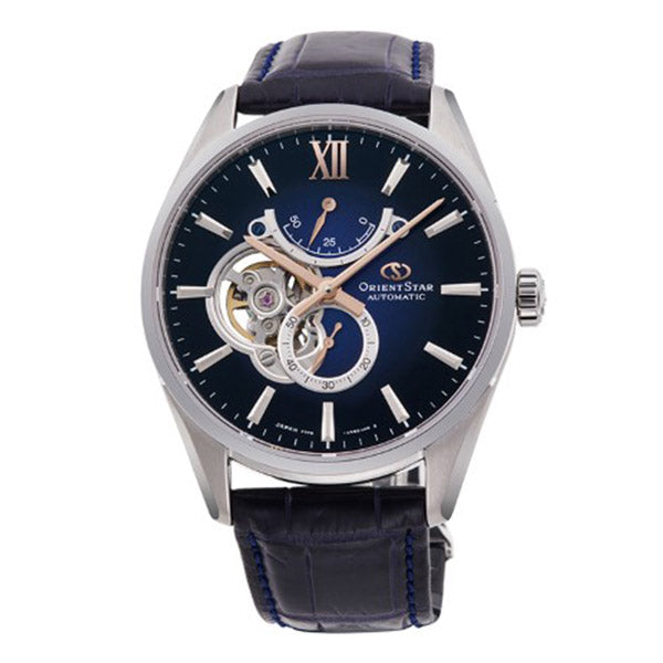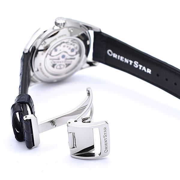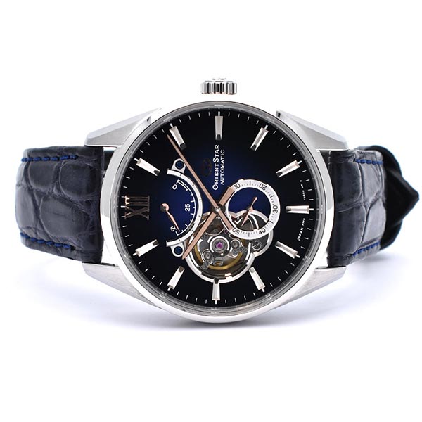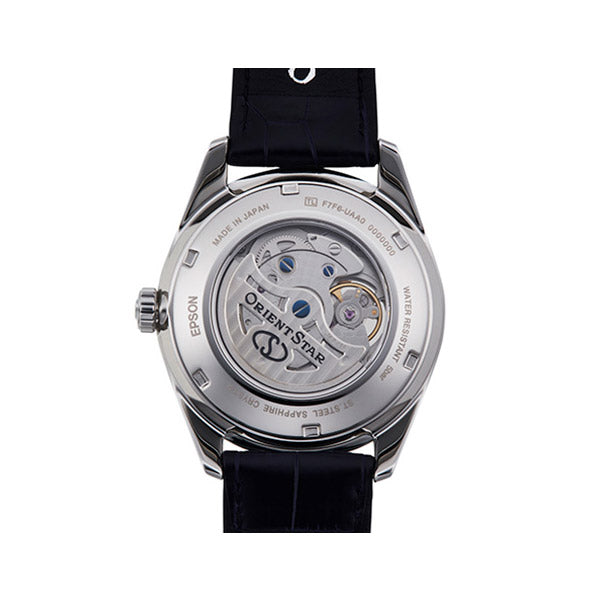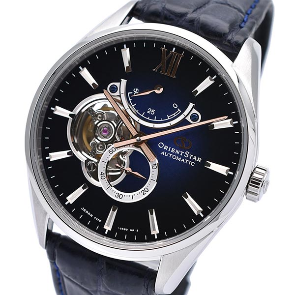 オリエントスターは、1950年のオリエント創業と同時に"輝ける星"として生まれた代表的なブランド。その名にふさわしく、歴史に裏付けされた技術と、ディテールにまで配慮した粋なデザインの機械式時計を展開。ムーブメント「46系 F7-50」を搭載したモデル。グラデーション文字盤にピンクゴールドの挿し色が華やかさを演出。風防には反射を99%抑える「SARコーティング」を採用し、どの角度から見ても視認性が高いのが特徴です。広々としたダイヤルデザインと高級感あふれるデザインに、9時位置の部分スケルトンから覗くムーブメントがワンランク上の腕元を演出。