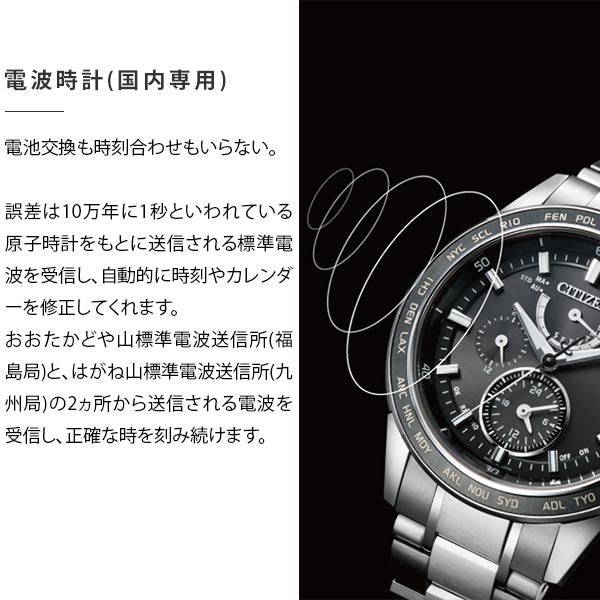 | 仕様 | 電波時計 エコドライブ 精度:±15秒/月(非受信時) ねじロックりゅうず パーペチュアルカレンダー ナチュライト 衝撃検知機能 針補正機能 時差修正機能 |