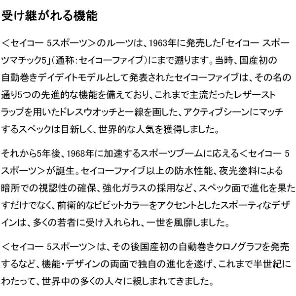 主に海外で人気を博していたセイコー5と通称されていたモデルが新しくセイコー5 スポーツとしてリニューアルいたしました。1963年に国産初の自動巻きデイデイトモデルとして発売された通称セイコー5を原点としています。新セイコー5 スポーツは、歴史あるセイコー5 スポーツのDNAを現代風にアップデートしたメカニカルウオッチです。