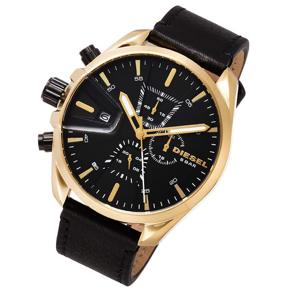 GIグラスにインスパイアされた9時位置のカットクリスタルが特徴のMS9のクロノグラフモデル。ゴールドのケースにブラックのダイアルとレザーストラップを組み合わせたクールな印象のデザインです。細かなインダイアルが並んだ手の込んだディテールはDIESELならでは。精悍なミリタリーテイストを漂わせながら、クリーンで端正ルックスなので、幅広いシーンにマッチします。