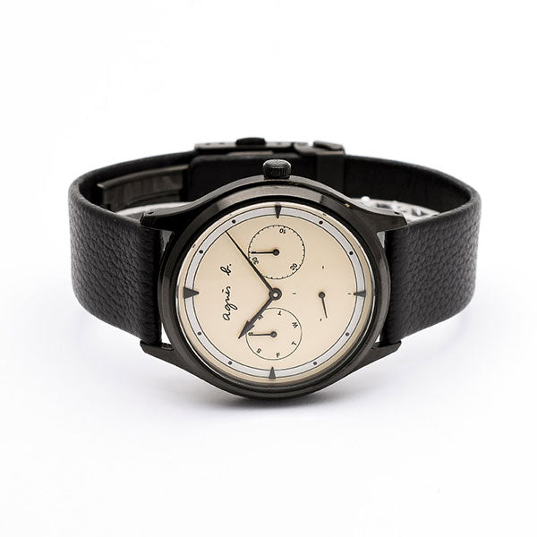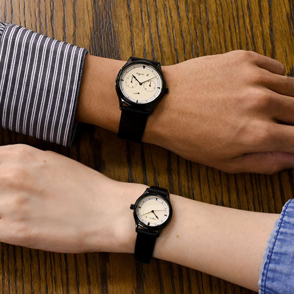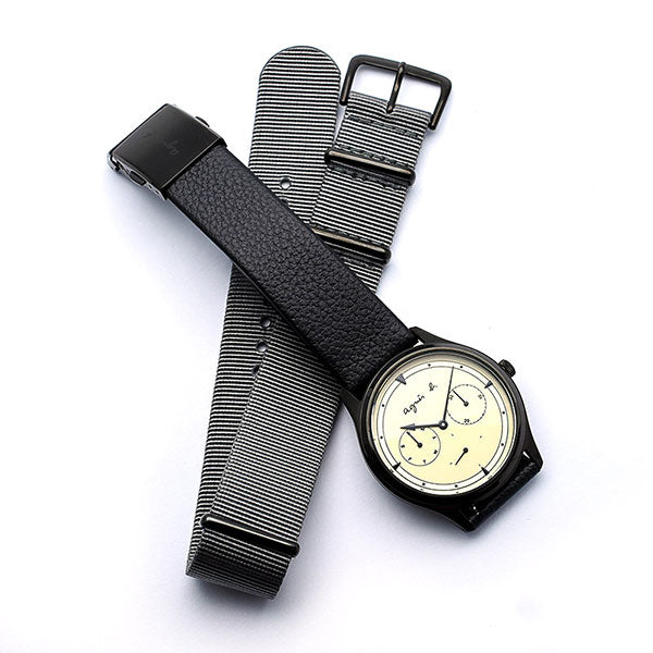 大好評のagnes bから新作が登場。チェンジャブルレザーバンドとナイロンバンド、さらにレバーピン単体が付属。工具不要でバンド交換が可能で、その日の気分にあわせたバンドの付け替えを楽しむことができます。レザーでクラシックな雰囲気も、トレンドのナイロンでアクティブな雰囲気も出すことができ、ファッションに合わせて使い勝手抜群!手書きマルチェロシリーズとはまた違った新鮮さを感じるドット略字と5分刻みミニッツレールの文字盤デザイン