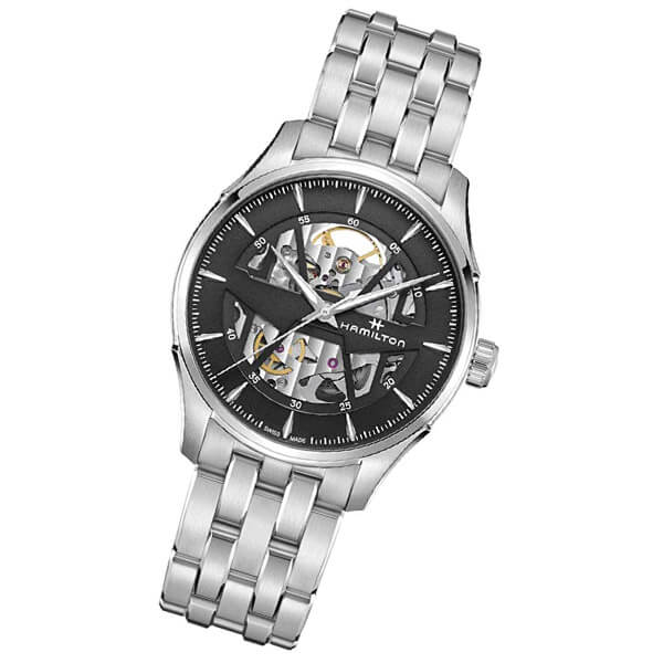 精度と美しさを湛える「ジャズマスター スケルトン」。ハミルトンのシンボルが大胆にあしらわれたカットアウトダイヤルからは、ユニークなタイムピースを駆動する高精度なムーブメントを眺めることができます。
