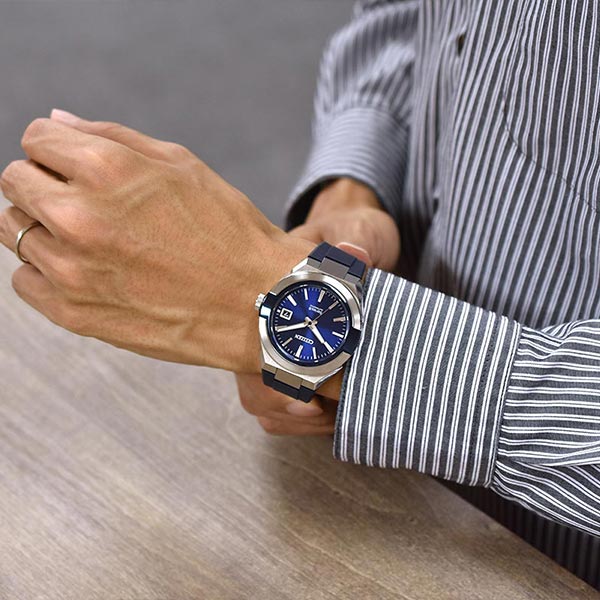 | 仕様 | 耐磁2種 夜光(針+インデックス) 日差-5秒~+10秒 振動数:28,800回/時 石数:24石 秒針停止機能 日付早修正機能 駆動時間約50時間(最大巻上時) |