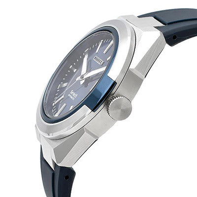 ・太めの針とシンプルなインデックスを配置した、見やすく飽きのこないデザイン。大きめのりゅうずが巻上げをスムーズにするとともに、力強い印象を与えます。