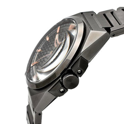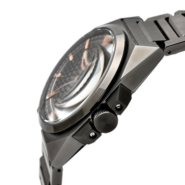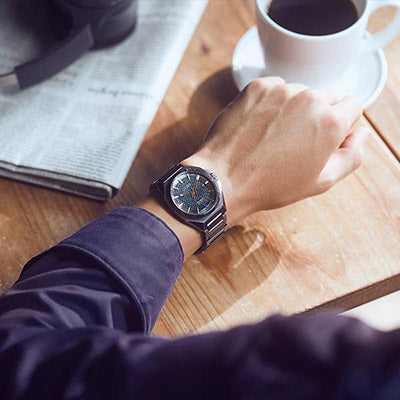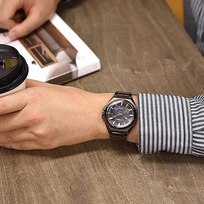 ・直線的なラインを活かしたケースとバンドに粗めのヘアライン加工を施し、ソリッド感を強調。大きめのりゅうずが巻上げをスムーズにするとともに、力強い印象を与えます。