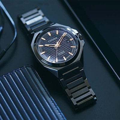 新開発の機械式ムーブメントを搭載して再始動したモダンでスタイリッシュな実用的機械式時計ブランド「Series 8(シリーズエイト)」。白蝶貝と格子状の金属を重ねた多層構造の文字板が、鮮やかな存在感を演出します。