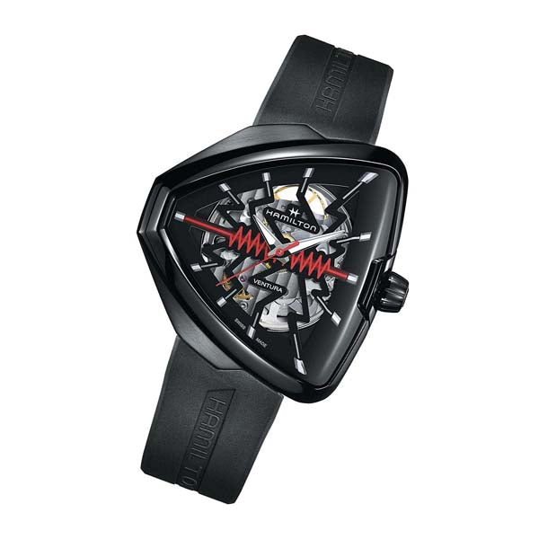 圧倒的な存在感を放つ「ベンチュラ Elvis80 スケルトン」は、世界初の電池式腕時計の過去、現在、未来を讃えるトリビュート。革新的なタイムピースが、力強くモダンなスタイルに昇華。中央の赤いジグザグのパルスが際立つスケルトンダイヤルは、ブラックPVD加工が施された三角形のケースに収められています。