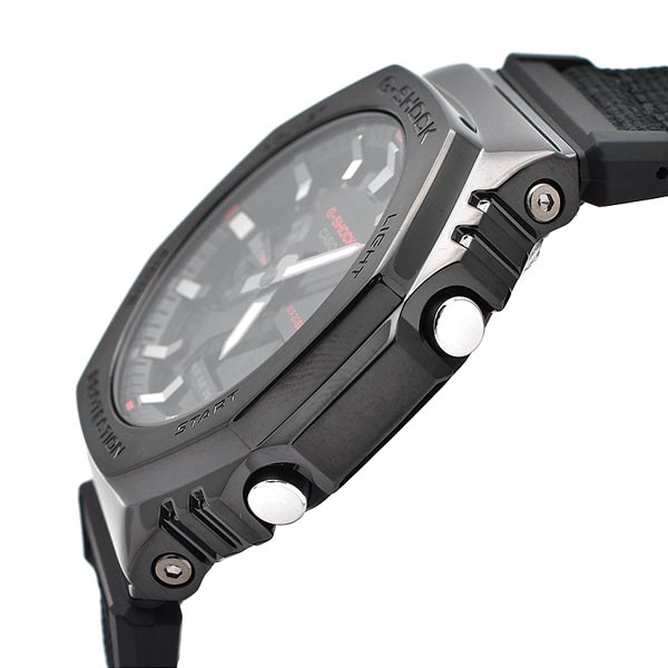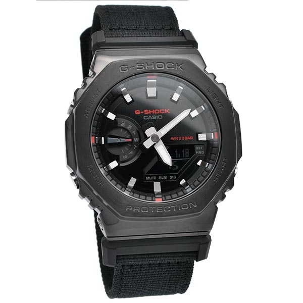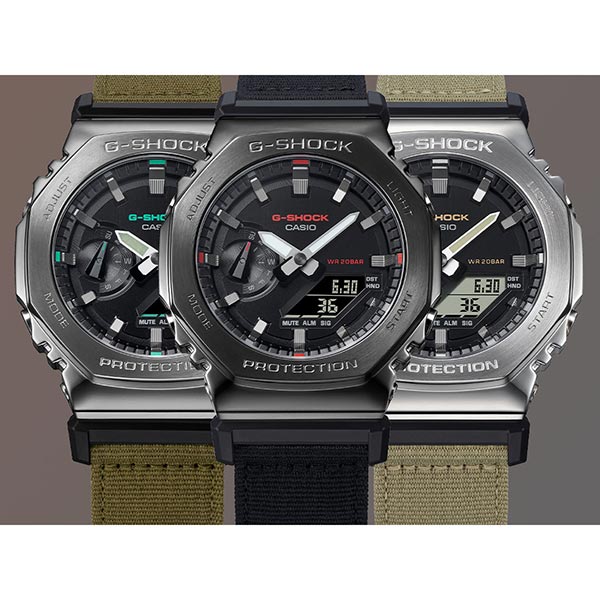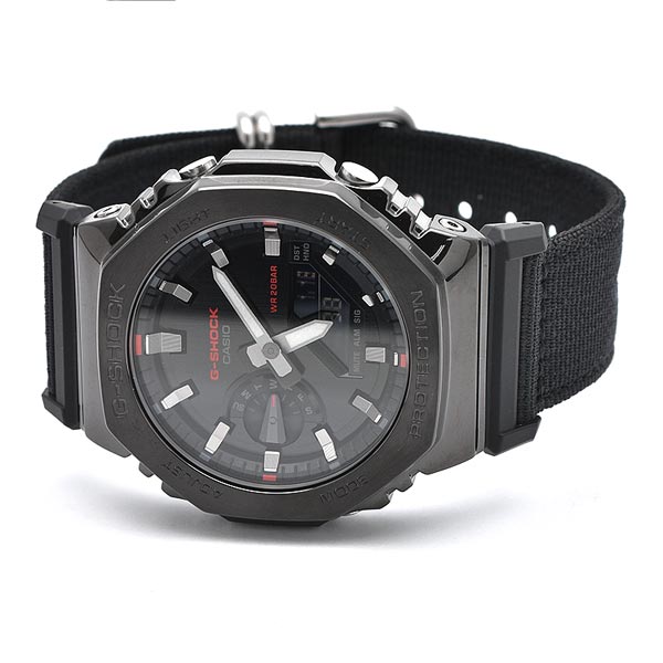 八角形フォルムのメタルカバードデザインが特徴の GM-2100に、クロスバンドを採用したNewモデルが登場。メタルとクロスの異素材を組み合わせることで、洗練されたルックスにタフでカジュアルなイメージをプラス。更にブラック文字板と蒸着インデックスの質感の違いが高い視認性を実現しています。アウトドアテイストのクロスバンドのカラーリングが、コーディネートの幅を広げます。