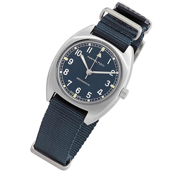 1970年代に英国空軍のために製造されたモデルを復刻した「カーキ パイロット パイオニア メカ」。存在感を放つアビエーションブルーの文字盤は、腕元でハミルトンの航空計時の歴史を称えます。