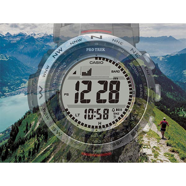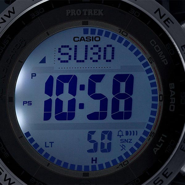 | 仕様 | ・タフソーラー(ソーラー充電システム) ・電波受信機能:自動受信(最大6回/日)(中国電波は最大5回/日)/手動受信、<日本>受信電波:JJY、周波数:40kHz/60kHz(福島/九州両局対応モデル)<北米地域>受信電波:WWVB、周波数:60kHz<ヨーロッパ地域>受信電波:MSF/DCF77、周波数:60kHz/77.5kHz<中国>受信電波:BPC、周波数:68.5kHz*ホームタイム設定を受信可能な都市に設定すると、都市に合わせた局を受信します。尚、時差は選択した都市によって設定されます。 ・ワールドタイム:世界48都市(31タイムゾーン、サマータイム設定機能付き)+UTC(協定世界時)の時刻表示、ホームタイムの都市入替機能 ・方位計測機能:16方位・方位の角度(0~359°)を計測、東西南北をグラフィック表示、方位連続計測(60秒)、ベアリングメモリー(目標(目的地)の方位を記録して記録した方向を示す)、磁気偏角補正機能、方位補正機能(2点補正) ・気圧計測機能(計測範囲:260~1,100hPa、1hPa単位)、気圧傾向グラフ(42時間分)、気圧差インジケーター(±10hPa)、気圧傾向インフォメーションアラーム(特徴的な気圧の変化が起こった場合に矢印と報音でお知らせします) ・高度計測機能/相対高度計(計測範囲:-700~10,000m、1m単位)、高度差インジケーター(±3000m)、高度傾向グラフ、計測間隔設定機能(5秒/2分毎)※最初の3分間のみ1秒毎、高度メモリー(計測年月日・時刻・高度を最大30本マニュアルメモリー)、自動記録データ(最高/最低高度、オート積算(上昇/下降)メモリー)• ・温度計測機能(計測範囲:-10~60℃、0.1℃単位) ・日の出・日の入時刻表示 ・ストップウオッチ(1/10秒、1000時間計、スプリット付き) ・タイマー(セット単位:1分、最大セット:24時間、1秒単位で計測) ・時刻アラーム5本(1本のみスヌーズ機能付き)・時報 ・バッテリーインジケーター表示 ・パワーセービング機能(暗所では一定時間が経過すると表示を消して節電します) ・フルオートカレンダー ・12/24時間制表示切替 ・耐低温仕様(-10℃) ・操作音ON/OFF切替機能 ・LEDバックライト(フルオートライト、スーパーイルミネーター、残照機能、残照時間切替(1.5秒/3秒)付き) ・フル充電時からソーラー発電無しの状態での駆動時間 機能使用の場合:約6ヵ月、パワーセービング状態の場合:約22ヵ月 ※電波受信が行われない場合は、通常のクオーツ精度(平均月差±15秒)で動作します。 ※高度計は気圧変化を高度に変換する相対高度計です。気圧が気象条件により変化すると、計測値の高度も変化します。 |
