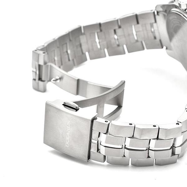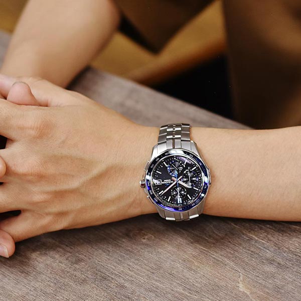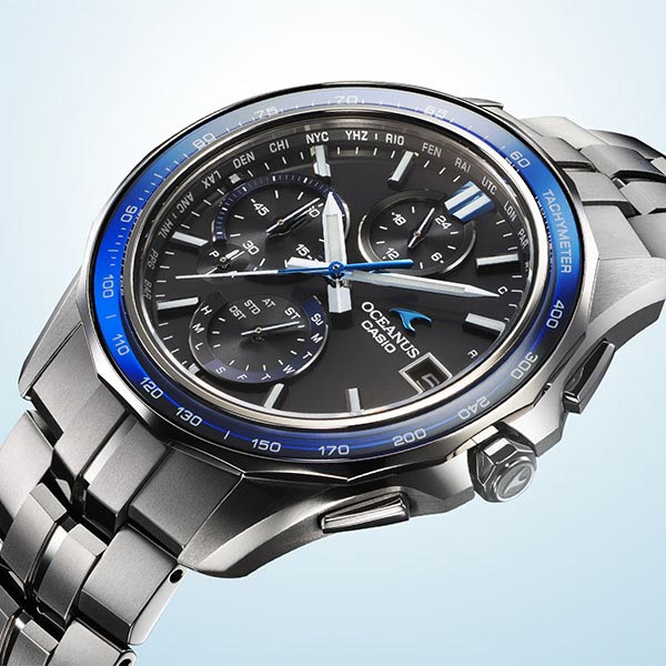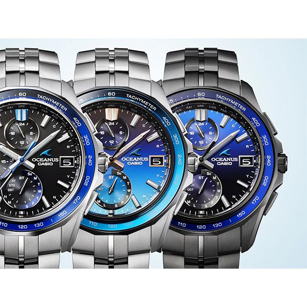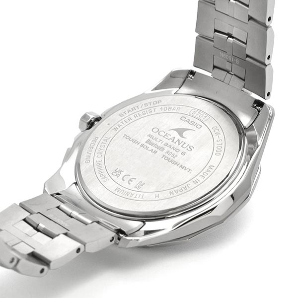 “Elegance,Technology”をブランドコンセプトに、上質な仕上げと薄く美しいフォルムを追求しているOCEANUS Manta(マンタ )より、流麗かつスポーティなフォルムに仕上げたOCW-S7000です。ベゼルにはリング状に加工したサファイアガラスを配し、サファイアガラスの裏面をブルー蒸着で着色。見る場所や角度で表情が変わっていく、美しい青の輝きをお楽しみいただけます。機能面では標準電波受信機能による時計単体での時刻修正に加え、Bluetoothを利用したスマートフォンリンクによる時刻修正機能を搭載。高機能を厚さ9.5mmのスリムケースに収め薄く美しいフォルムも実現。