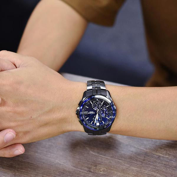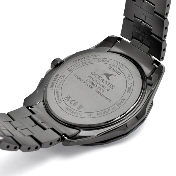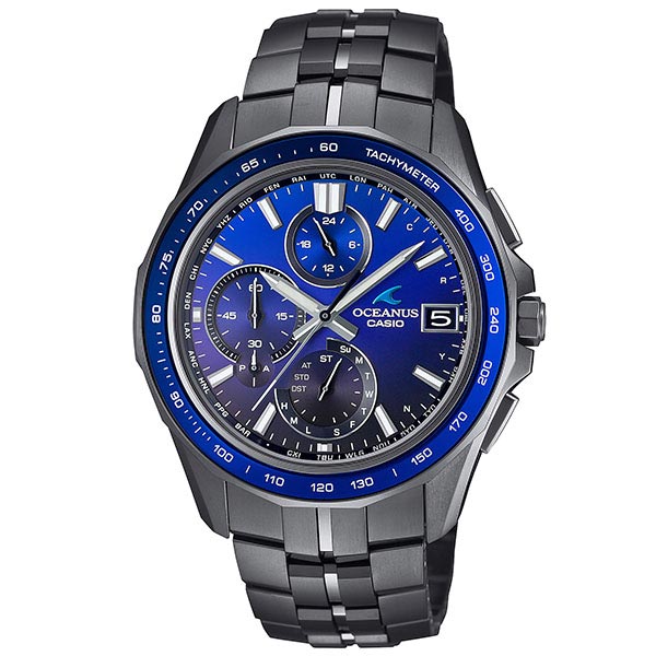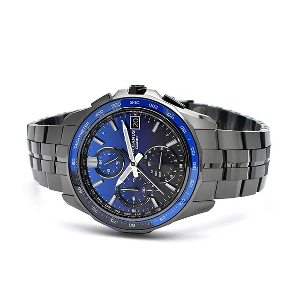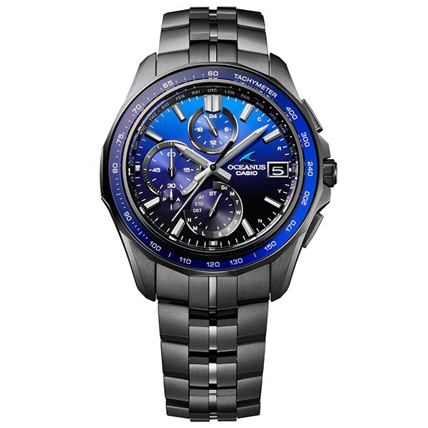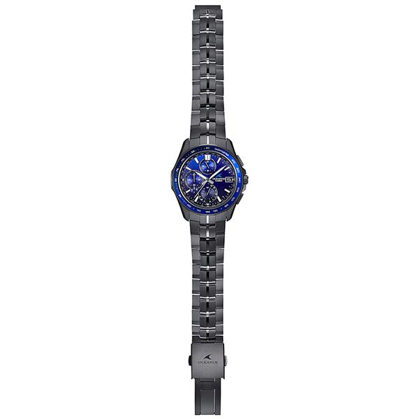 “Elegance,Technology”をブランドコンセプトに、上質な仕上げと薄く美しいフォルムを追求しているOCEANUS Manta(マンタ )より、流麗かつスポーティなフォルムに仕上げたOCW-S7000です。ベゼルにはリング状に加工したサファイアガラスを配し、サファイアガラスの裏面をブルー蒸着で着色。見る場所や角度で表情が変わっていく、美しい青の輝きをお楽しみいただけます。文字板には、ブルーからブラックに変化するグラデーション蒸着を施しています。機能面では標準電波受信機能による時計単体での時刻修正に加え、Bluetoothを利用したスマートフォンリンクによる時刻修正機能を搭載。高機能を厚さ9.5mmのスリムケースに収め薄く美しいフォルムも実現。 OCWS7000B2AJF