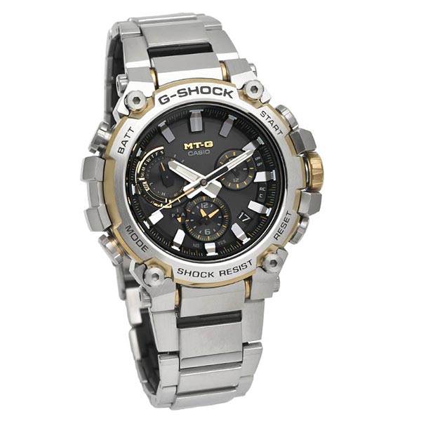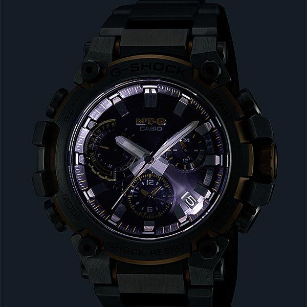 独自の設計思想により、メタル素材とG-SHOCKの起源である樹脂素材を融合して革新的な構造美を追求するMT-Gシリーズ。MTG-B3000はカーボン強化樹脂ケースでモジュールを保護し、外側をメタルパーツで覆った「デュアルコアガード構造」を更に進化させました。