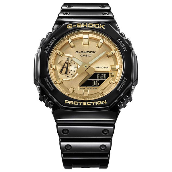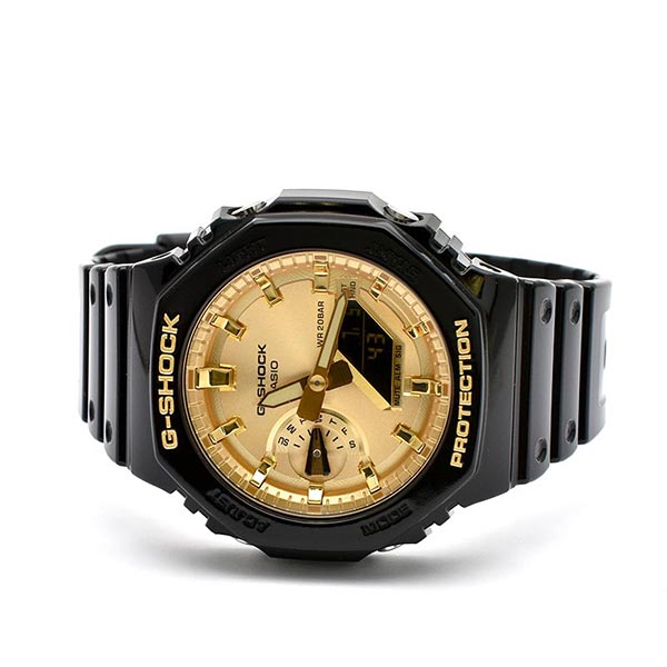 1983年の発売以来、飽くなき強さを求めて進化を続けるタフネスウオッチG-SHOCK。八角形デザインが特徴的なGA-2100シリーズのカラーモデルです。モデル全体を光沢感のあるブラックとマットな質感のブラックでそれぞれ統一し、フェイスに人気のゴールドとシルバーの蒸着文字板を採用。シックでファッションアイテムとして活用できるデザインに仕上げました。タフネスとデザイン性を両立した、幅広くご利用いただけるクールなデザインとなっております。