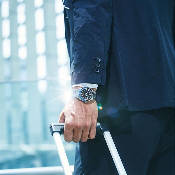 ・機械式時計で人気の高いGMT機能を搭載した新キャリバー「Cal.9054」を採用。24時間針(GMT機能)を使い2つの都市の時間帯を表示できます。両回転ベゼルを使うことで3つの都市の時刻確認もできます。