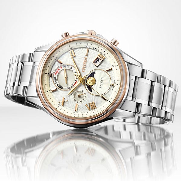 確かな品質と洗練されたデザイン。大人のためのドレスウオッチ、シチズン EXCEED(エクシード)。月の周りに広がる光の輪「月暈(つきがさ)」をテーマにした、月齢自動計算機能「ルナプログラム」搭載モデルです。