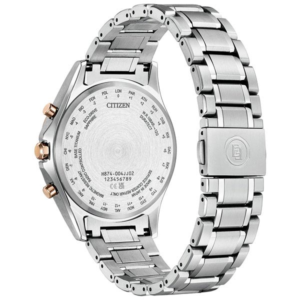 | 仕様 | 耐ニッケル 耐磁1種 夜光(針) 月差±15秒(非受信時) デイ&デイト表示 24時間表示 月齢表示(ムーンフェイズ) 月齢自動計算機能 北・南半球月齢表示切替機能 パーペチュアルカレンダー 日中米欧電波受信 受信局自動選択機能 定時受信機能 強制受信機能 ワールドタイム機能(24時差) サマータイム機能 衝撃検知機能 針自動補正機能 充電量表示機能 充電警告機能 過充電防止機能 パワーセーブ機能 フル充電時約2.5年可動(パワーセーブ作動時) キャリバーNo.H874 |