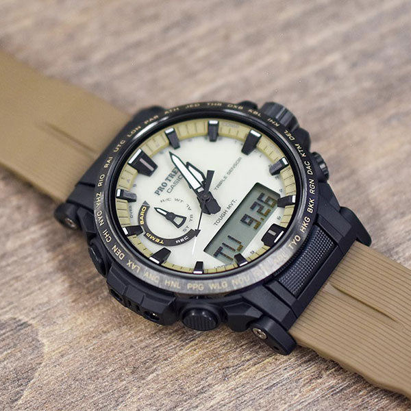 自然を愛する人の本格アウトドアギアPRO TREKクライマーラインから、PRW-61LDのご紹介です。ケースおよびバンドと樹脂製の裏蓋には環境負荷の低減が期待されるバイオマスプラスチック樹脂を採用、環境への配慮を形にしました。PRW-61LDは、夜間のアウトドアシーンでの実用性向上のため、全面蓄光文字板を採用しました。文字板のインデックスやバンドにダークコヨーテカラーを採用し、アウトドアにふさわしいカラーとしています。 PRW61LD5JF