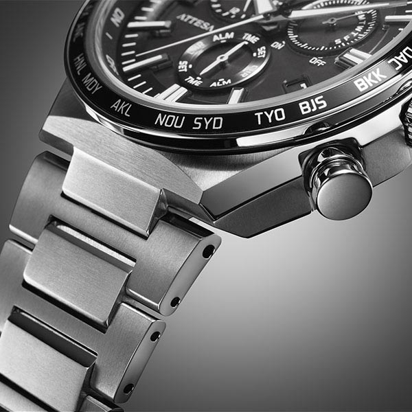 チタニウムで次世代を進み続ける、シチズン ATTESA(アテッサ)。エッジの効いたスポーティな表情がきわだつフルフローケースのACT Lineに、クロノグラフを搭載した光発電エコ・ドライブ電波時計が登場。ビジネススーツにもカジュアルなファッションにもフィットするACT Lineの新作です。別体の金属リングを組み合わせた立体的な文字板と力強いインデックスが、キリっとしたコントラストのある顔つきを表現しています。ケースとバンドのアウトラインを一体化し、エッジを効かせたフルフローケースを採用。スポーティな印象とさりげない個性をプラスしています。シルバーモデルは、ブラックの文字板を組み合わせたオーソドックスなカラーリング。ブラックチタンシリーズのDLCモデルは、大人っぽいダークブルーの文字板にアクセントとしてゴールドの秒針を合わせて高級感を演出しています。