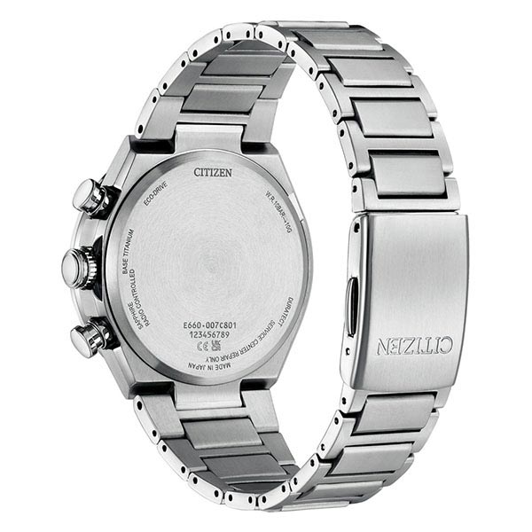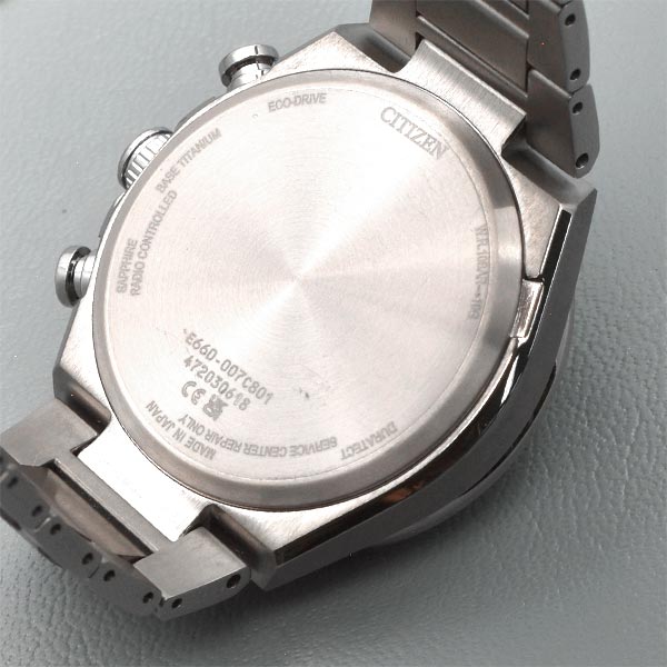 | 仕様 | 耐メタル 夜光(針+インデックス) フィットアジャスター 月差±15秒(非受信時) デイ&デイト表示 24時間表示 パーペチュアルカレンダー 日中米欧電波受信 1/1秒クロノグラフ(60分計) アラーム 受信局自動選択機能 定時受信機能 強制受信機能 ワールドタイム機能(24時差) サマータイム機能 充電量表示機能 充電警告機能 過充電防止機能 パワーセーブ機能 フル充電時約3年可動(パワーセーブ作動時) キャリバーNo.E660 |