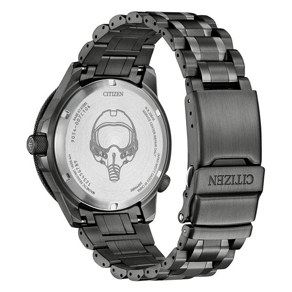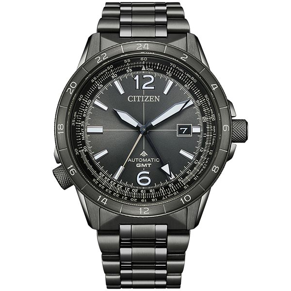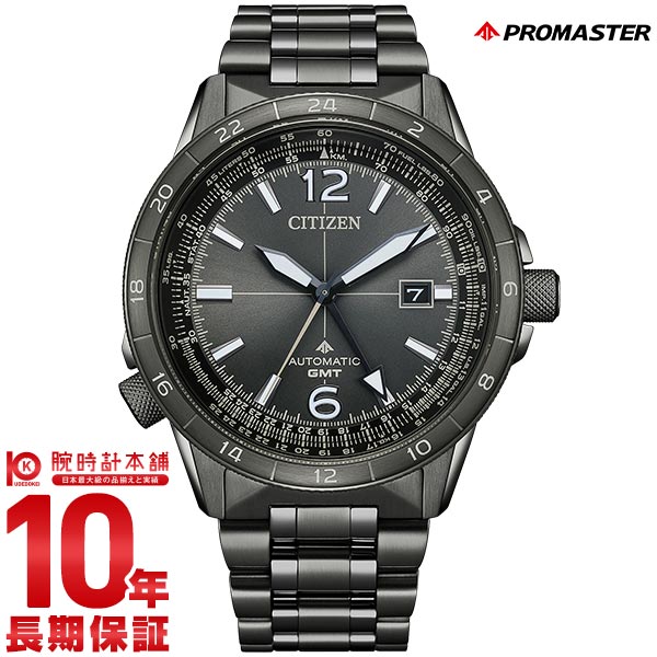 機能性、耐久性、安全性を兼ね備えた本格スポーツウオッチ、シチズン PROMASTER(プロマスター)。本格派のパイロットウオッチ「SKY」シリーズから、GMT機能を搭載したメカニカルモデルが初登場。GMT機能を搭載したハイスペックなメカニカルムーブメント「Cal.9054」を採用。ベゼルに24時間表記を施した王道のデザイン、りゅうずの操作で時針が連動する本格的な仕様です。視認性に優れた太く力強い時分針・24時間針、過去のSKYシリーズを継承したインデックスのデザイン、丸みを帯びた個性的な形状のベゼル、それぞれのパーツをバランスよく組み合わせてGMT機能をきわだたせています。ヘアラインを多用したケースやバンドの一部に鏡面仕上げを取り入れた華やかな仕上がり。ケースとバンドをつなぐラグは、大空を軽やかに飛ぶ飛行機のエアロフォイルに着想を得た形状です。堅牢性を高めるねじロックりゅうずを3時の位置に採用。また、万が一の計器トラブルなどの際に活躍する航空用計算尺機能を回転見返しリングに配置し、操作性も追求しています。裏ぶたには、パイロットが安心して身に着けられる道具の象徴として、航空ヘルメットを刻印しています。