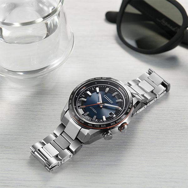 チタニウムで次世代を進み続ける、シチズン ATTESA(アテッサ)。ACT Lineの大人気モデル「AT8185-62E」のフォルムを踏襲しながらほどよい大きさにダウンサイジングした新モデル。アクティブな存在感と立体感が魅力の3針タイプです。人気の高いACT Line「AT8185-62E」のケースやバンドの形状を踏襲しながら、ひとまわり小さめのケースを採用。バランスよく存在感のあるサイズを追求しました。パーツを重ねた3体構造の文字板がアクティブな表情を演出。外から内への段差で立体感を強調するとともに、テーパーをつけたインデックスで中心に向かって力が凝縮していく動きを表現しています。様々なシーンにフィットするブラック×ブラック、すっきりシャープな印象のシルバー×ブルーの2タイプ。大人気モデル「AT8185-62E」をイメージさせるカラーリングの、新たなモデルが登場です。
