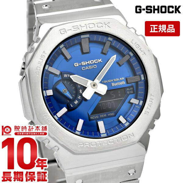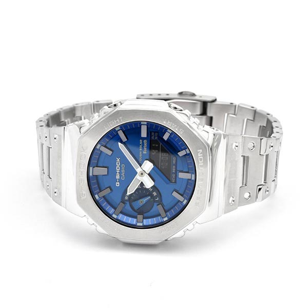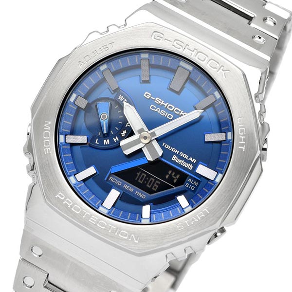 1983年の誕生以来タフネスを追求するG-SHOCKから、フェイスに鮮やかなブルーを採用したフルメタルシリーズです。文字板にメタリックブルーの蒸着加工を施すことで、ステンレス製のベゼルとバンドに調和させています。フルメタルによる耐衝撃構造を実現するために、ベゼルとケースの間には、ファインレジン製の緩衝材を実装。また、バンド接続部を3本足構造とし、連結パイプに加わる衝撃を分散。メタル製のバンドピースにディンプル加工を施し、初号機の樹脂バンドデザインを継承しました。裏蓋には、気密性に優れたスクリューバックを採用しています。 GMB2100AD2AJF