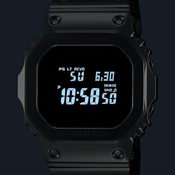 1983年の誕生以来タフネスを追求するG-SHOCKから、フェイスに鮮やかなブルーを採用したフルメタルシリーズです。ガラス面にメタリックブルーの蒸着加工を施すことで、ステンレス製のベゼルとバンドに調和させています。フルメタルによる耐衝撃構造を実現するために、ベゼルとケースの間には、ファインレジン製の緩衝材を実装。また、バンド接続部を3本足構造とし、連結パイプに加わる衝撃を分散。メタル製のバンドピースにディンプル加工を施し、初号機の樹脂バンドデザインを継承しました。裏蓋には、気密性に優れたスクリューバックを採用しています。 GMWB5000D2JF