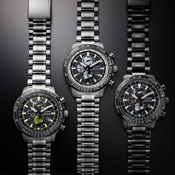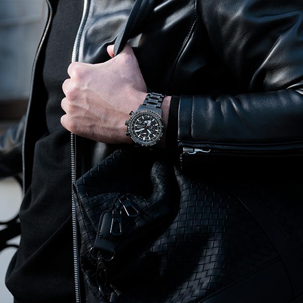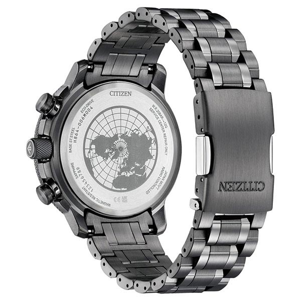 機能性、耐久性、安全性を兼ね備えた本格スポーツウオッチ、シチズン PROMASTER(プロマスター)。本格派のパイロットウオッチ「SKY」シリーズから、新キャリバー「H864」を搭載した新作が登場。6時側のサブダイヤルにUTC時刻を搭載した円板針を採用。6時位置のリングの数字と合わせると北半球にある都市の大まかな時刻を読み取れるユニークなモデルです。この円板針は一日かけてゆっくりと一周します。各都市表記や円板部の数字などには古地図や航空図でよく見られるフォントを採用し、世界の開拓が進んだ1600年代の知的なニュアンスを持たせています。あえて航空計算尺部分とは異なるフォントを活用することで判読性も追求しています。SKYシリーズのデザインを継承。堂々としたラージサイズの文字板とベゼルにも関わらず、すり鉢状のフォルムにすることで、軽く、着け心地がよいケースボディに。ヘアラインを生かしてマットに仕上げながら、ベゼルの斜面やプッシュボタンガードなどにミラー加工をあしらい、メリハリを利かせています。モノトーン基調のベーシックモデル、ライムカラーの差し色で緑豊かな地球をイメージしたモデル、無骨な印象を与えるオールブラックモデルの3種類。裏ぶたには北半球の地図が刻印されています。