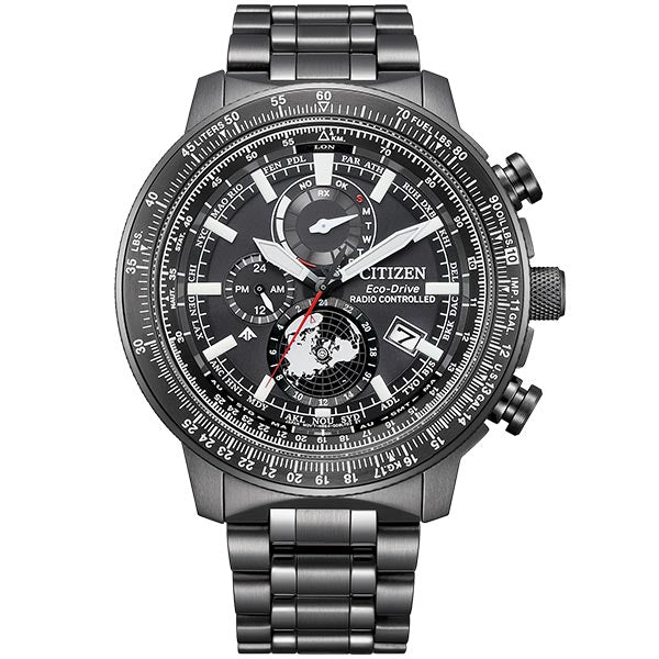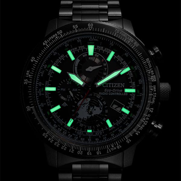 | 仕様 | 耐磁1種 夜光(針+インデックス) 航空計算尺 文字板部品:再生素材 ねじロックりゅうず 月差±15秒(非受信時) デイ&デイト表示 24時間表示 パーペチュアルカレンダー 日中米欧電波受信 受信局自動選択機能 定時受信機能 強制受信機能 ワールドタイム機能(26時差) 協定世界時(UTC)表示 サマータイム機能 衝撃検知機能 針自動補正機能 充電量表示機能 充電警告機能 過充電防止機能 パワーセーブ機能 フル充電時約2.5年可動(パワーセーブ作動時) キャリバーNo.H864 |