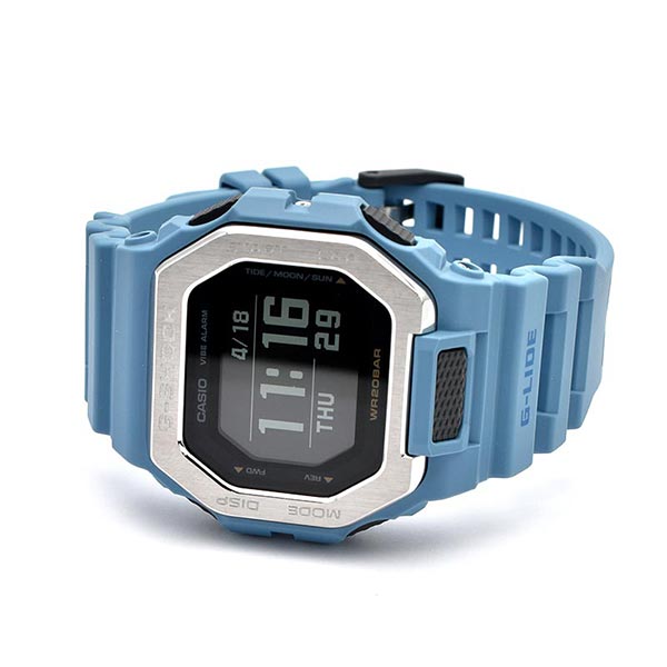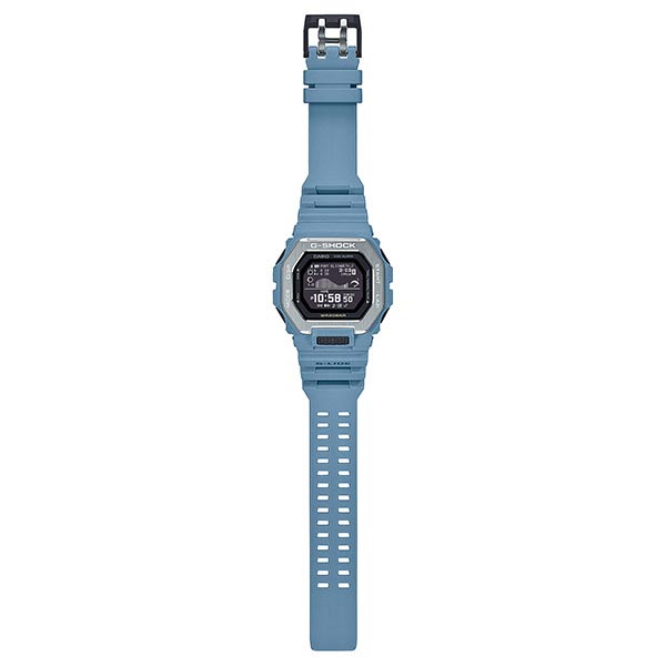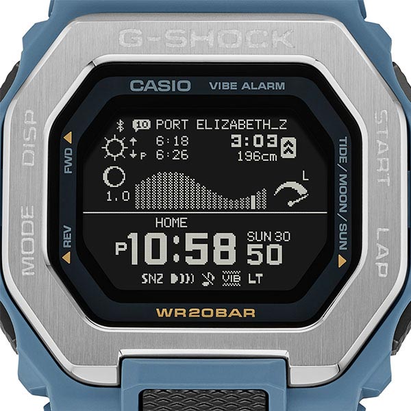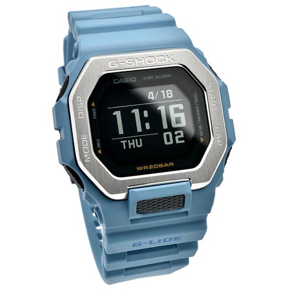 世界のトップサーファーから支持を受けるG-SHOCKのスポーツラインG-LIDE。スマートフォンリンクを搭載したGBX-100のビーチの自然な姿をイメージしたNewカラーです。サーファーが必要とする潮汐情報や日の出/日の入時間を、専用アプリケーションに内蔵されている世界約3300ポイントから選択し簡単に時計側に設定することができます。ワイドフェイスで高精細なMIP(メモリインピクセル)液晶を採用することで視認性を高め、タイドグラフ、ムーンデータ表示に加え、満潮/干潮時間、満潮/干潮の潮位、日の出/日の入時間が表示可能です。 GBX1002AJF